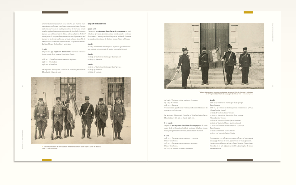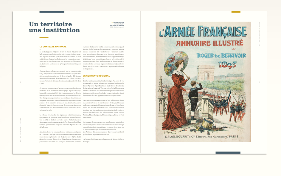 Les horreurs de la Seconde Guerre mondiale n’ont jamais effacé celles de la Première. Encore aujourd’hui, 1914-1918 reste la « Grande Guerre ». Pas seulement à cause des pertes énormes, mais sans doute aussi parce que, pour la première fois dans notre histoire, c’est toute la population française qui s’est trouvée impliquée pendant des années. Sur le front, ces « poilus » qui combattaient, qui mouraient, qui étaient blessés ou faits prisonniers, étaient paysans, ouvriers, instituteurs, étudiants. Ils étaient parfois poètes, comme Apollinaire, Péguy. Dans le Gard, un des départements les plus éloignés du front, chaque famille attendait des lettres et pleurait des morts, tout en faisant tourner une économie bouleversée, en accueillant les réfugiés de la zone des combats, en survivant malgré les restrictions et en trouvant encore de quoi financer les œuvres et emprunts de guerre. Dos carré cousu Rabats — 176 pages + 4 — 240X270 mm.