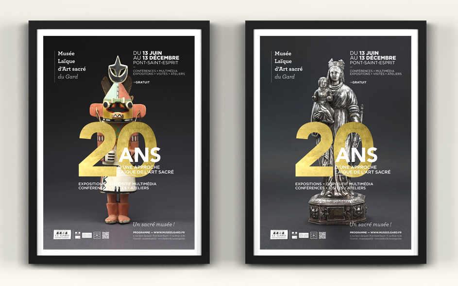 Situé à Pont-Saint-Esprit, le musée d’art sacré du Gard célèbre ses 20 ans. Logé dans une somptueuse demeure médiévale, classée monument historique, le musée d’art sacré propose une approche laïque et originale du fait religieux. Pour célébrer cet anniversaire, expositions, nouveau dispositif numérique, visites, ateliers et conférences sont proposés au public. Autant d’occasions de (re)découvrir ce lieu inattendu, fleuron du patrimoine architectural gardois et sa collection de haut niveau ! Moment charnière s’il en est, cet anniversaire des 20 ans fut l’occasion pour nous, en collaboration étroite avec la direction, de poser les bases de la future identité et de la communication du musée, tout autant que de travailler à tous les éléments de scénographie et de médiation online et offline. Photographies : M. Daspet et JL. Maby.