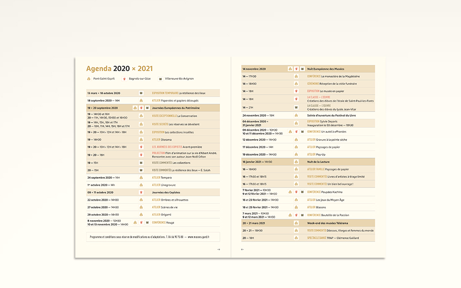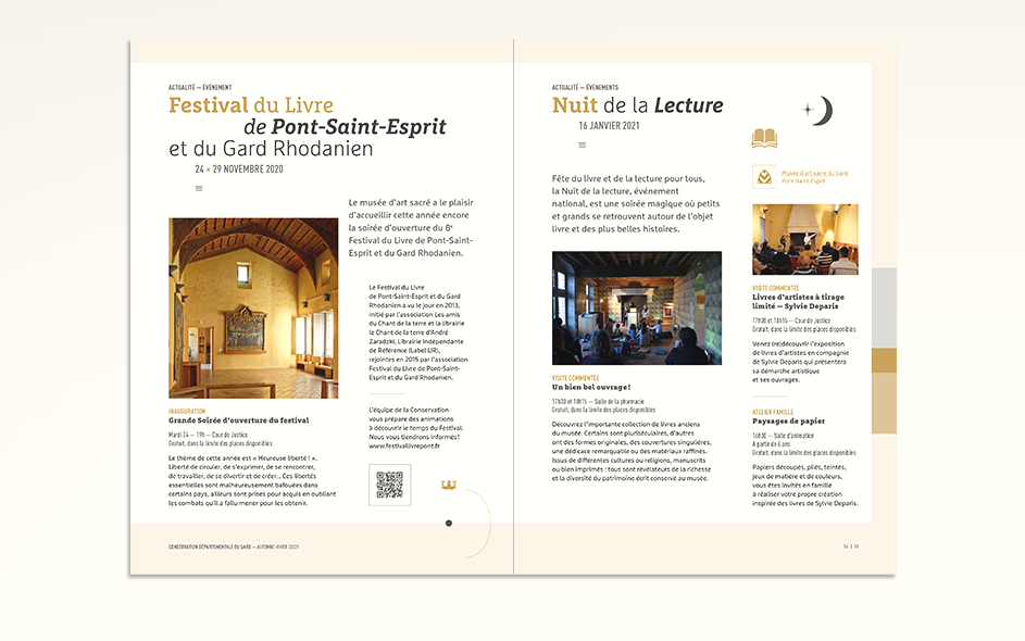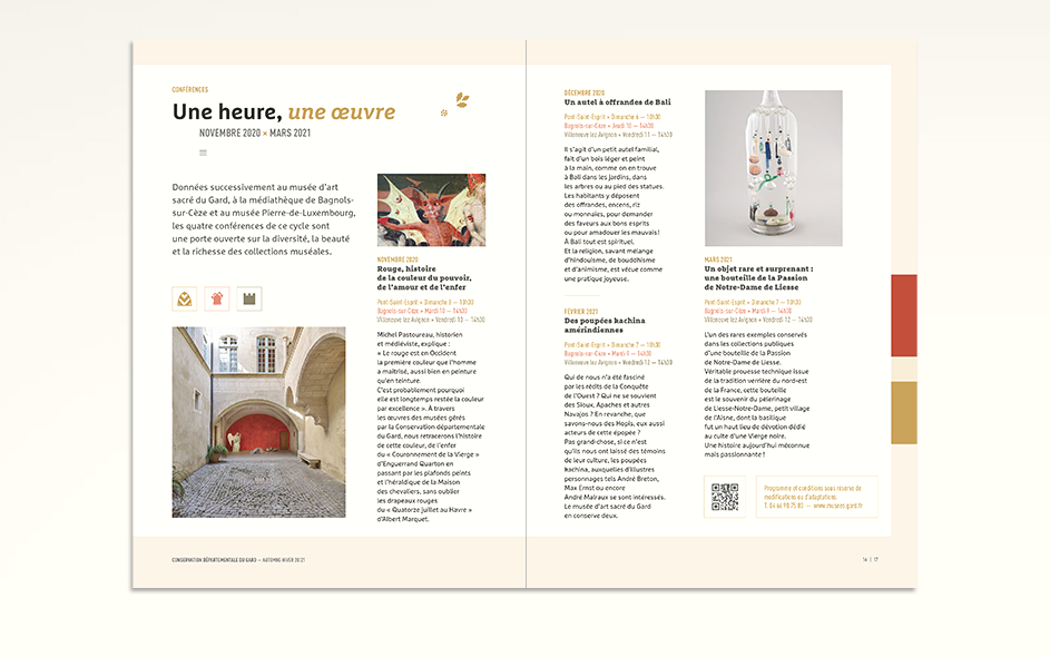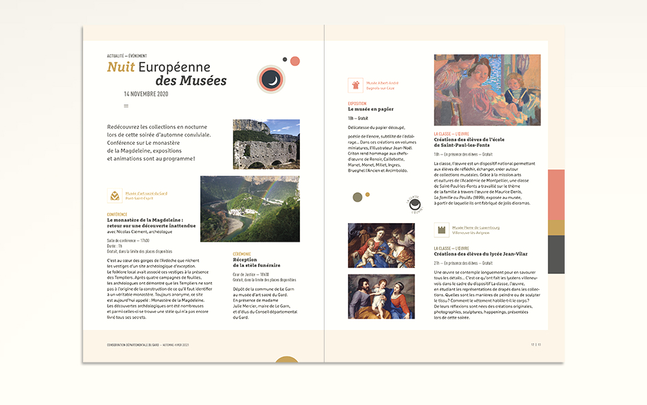 Jusqu’en 2022, la programmation culturelle de la conservation des musées du Gard était très riche et diversifiée. La conservation c’était un musée départemental situé à Pont-Saint-Esprit, deux musées à Bagnols-sur-Cèze et un musée à Villeneuve-les-Avignon. Chaque année, 4 à 6 expositions temporaires, des événements nationaux (journées du patrimoine, nuits des musées, nuits de la lecture, …), des ateliers, des conférences toutes les semaines, un cycle en biennale, des jeux et activités découvertes pour les enfants de tous âges, des visites thématiques, des coopérations diverses… La conservation ne disposait jusque là d’aucun support transversal permettant d’avoir une vue globale sur la totalité de sa programmation. Cette nouvelle brochure semestrielle, véritable outil de développement du territoire, aura le mérite de mettre en avant le travail des équipes du département autant que d’attirer encore plus de visiteurs tout en fidélisant les habitués.