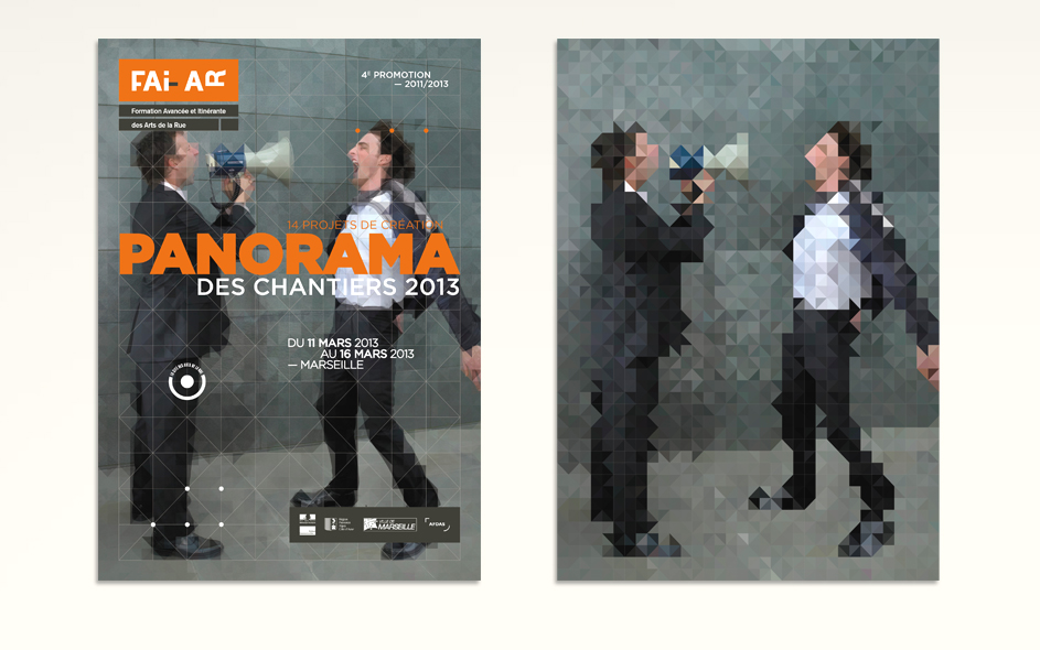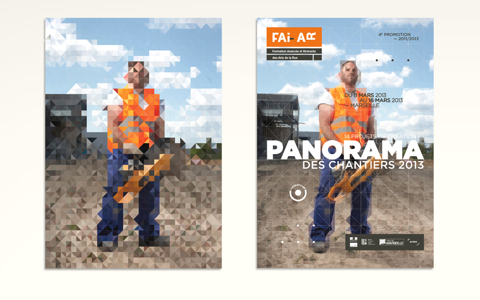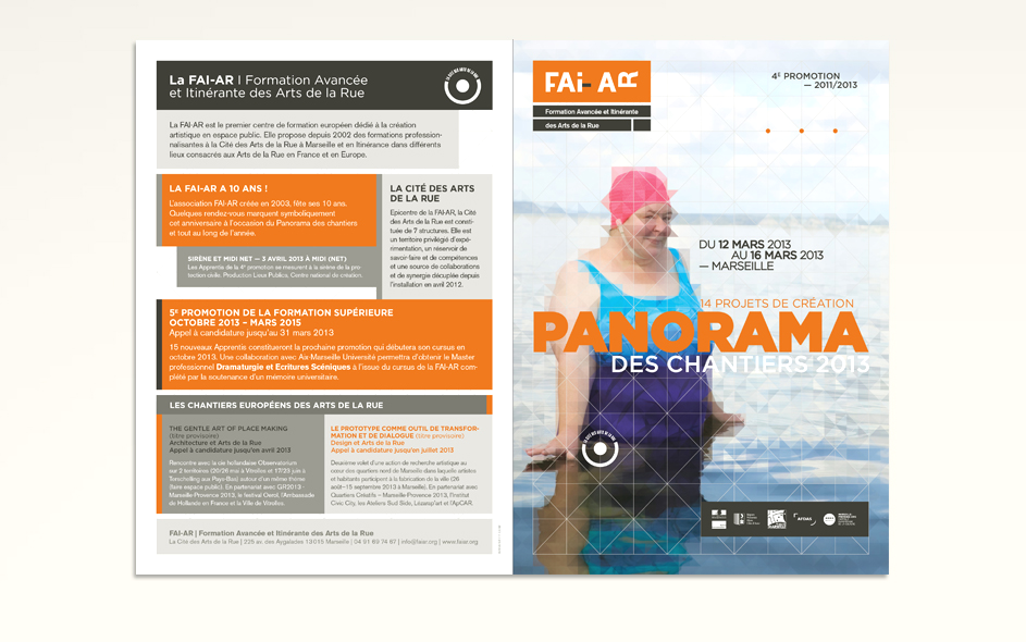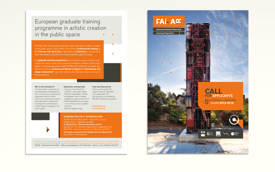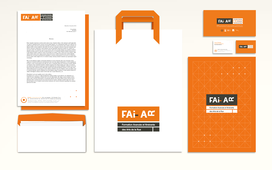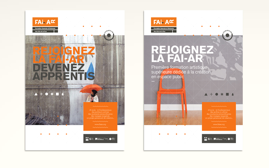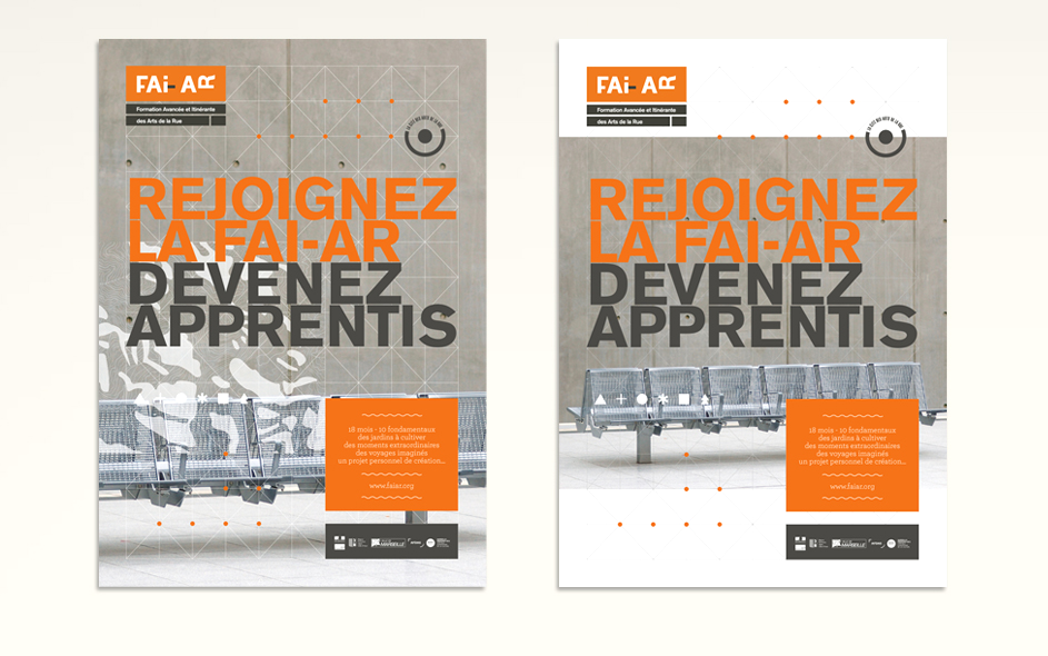 Les étudiants de la FAI-AR sont nommés apprentis en référence à l’école allemande du Bauhaus. Cette dénomination traduit le projet pédagogique de la FAI-AR qui associe apports théoriques, pratiques et expérimentations auprès de professionnels en activité. Le cursus de 18 mois est construit en itinérance entre Marseille et de nombreux points d’appui en France et à l’international. C’est dans ce même axe, ouvert sur plusieurs plans, que se déploie l’évolution de l’identité visuelle que nous avons élaborée ensemble.